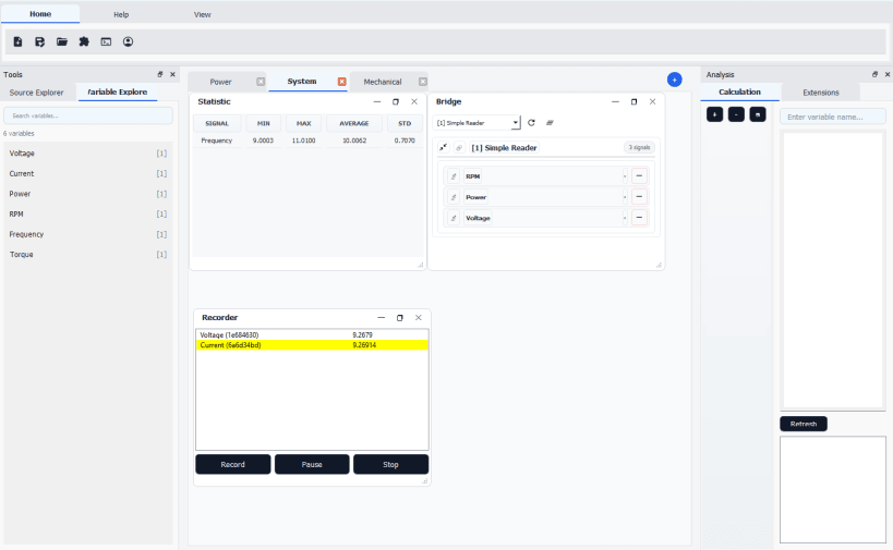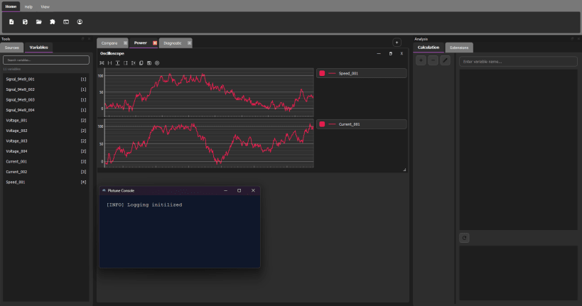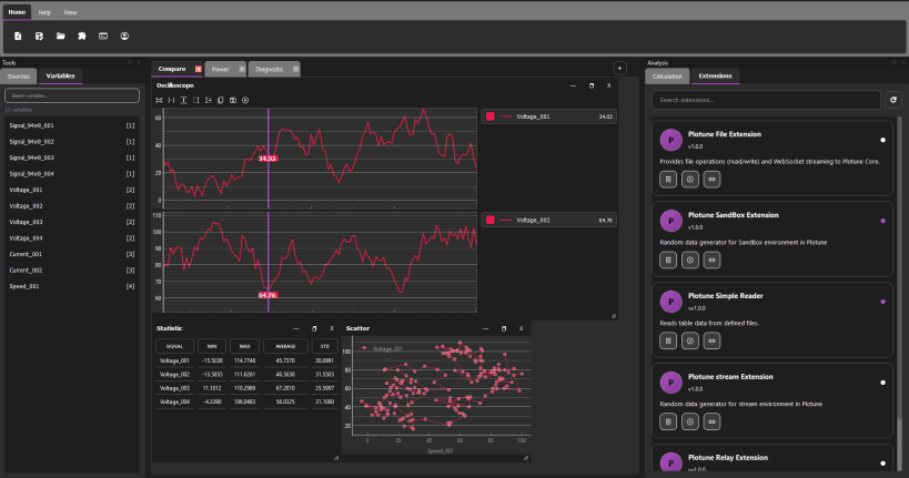 With a modern, component-based interface and an extension-driven architecture, Plotune enables engineers and researchers to build flexible dashboards, oscilloscope-style signal views, statistical panels, intelligent analysis workflows, and distributed measurement infrastructures without complex setup or heavy dependencies.