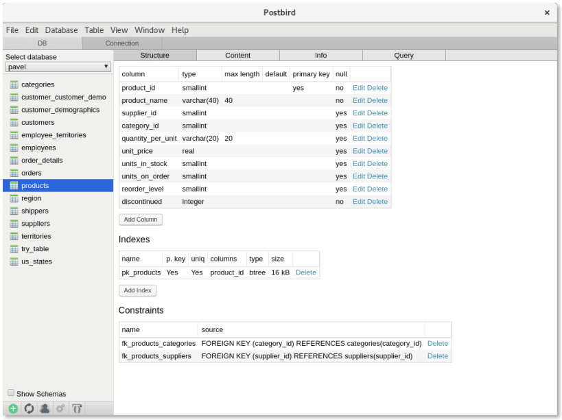 Postbird is a cross-platform PostgreSQL GUI client. Supports views, material views, foreign tables, constraints, schemas, connect to heroku's postgres. Can manage extensions, procedures, users, filter tables, edit values, import & export tables or databases. Have comfortable query editing with saving last query, syntax highlighting, keyboard shortcuts, search, snippets, query history, viewing large results, explain formatting, saving results as csv