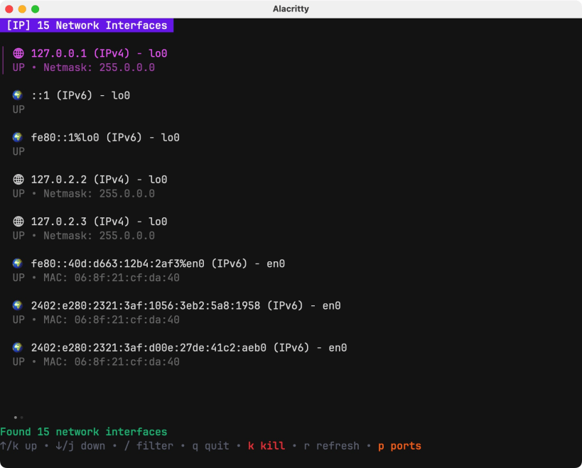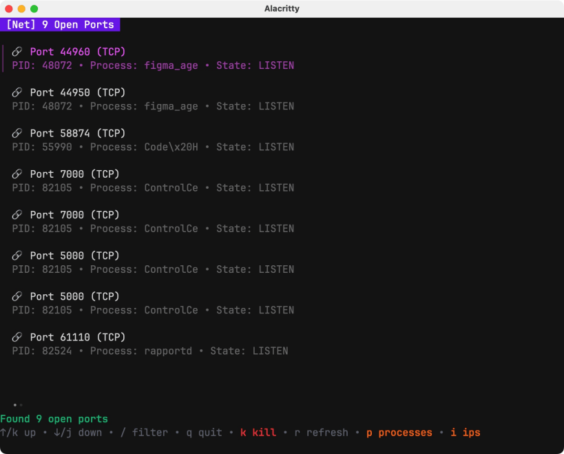 pttr: port and process terminator is cross-platform terminal UI application for viewing and managing open ports - process on your system.