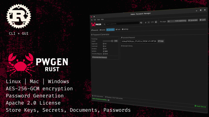 PwGen-Rust is a modern, secure password and secrets manager built in Rust.