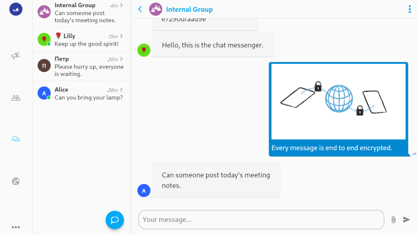 Automatically detect other qaul users nearby, broadcast public messages to everyone, create chat groups, send end to end encrypted chat messages, images & files.