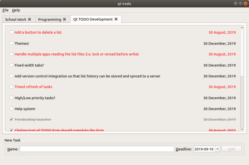 A simple, memory efficient GUI program for making TODO lists. It uses a TSV-style format for storing the lists. It allows for adding tasks and marking them as completed, and can work with many different lists at once through tabs.