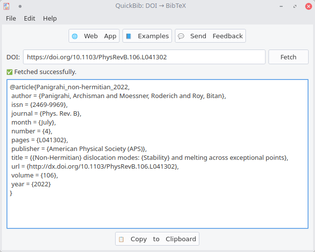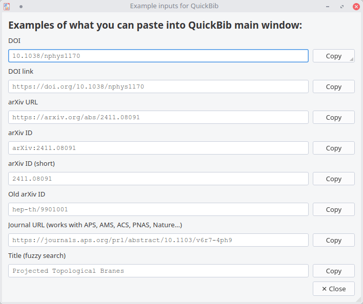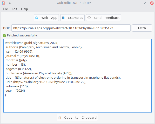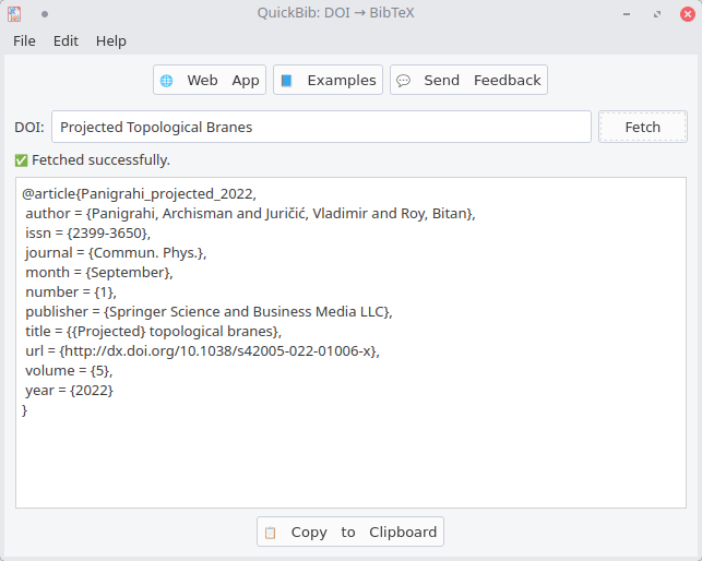 QuickBib is a small cross-platform desktop app that retrieves the BibTeX entry for a publication from its DOI (Digital Object Identifier). It supports DOIs, arXiv IDs and many journal URLs and uses the doi2bib3 library as its backend to fetch and format BibTeX entries.