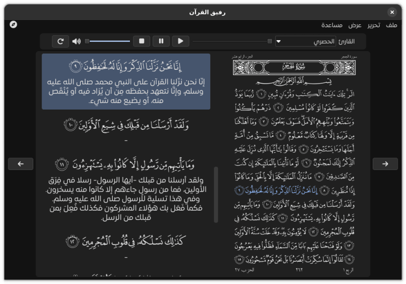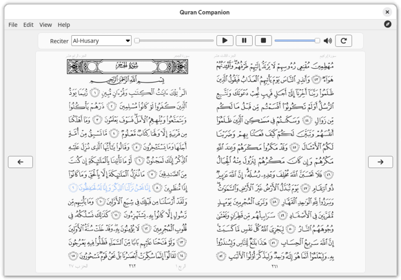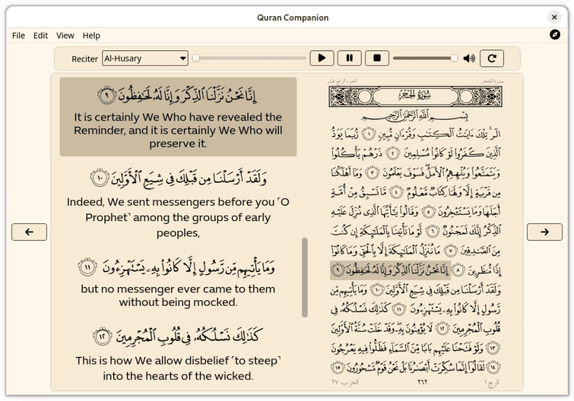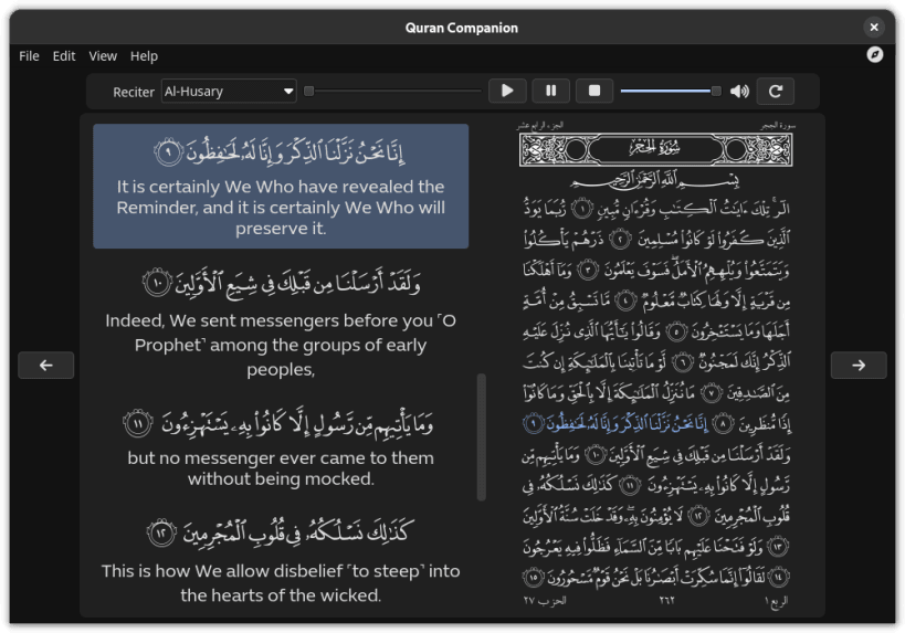 Quran Companion is a cross-platform Quran reader and player with recitation download capabilities, verse highlighting, resizable Quran font, and a variety of tafsir books and translations.