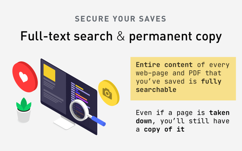 Full-Text Search & Permanent Library Entire content of every web-page and PDF that you’ve saved is fully searchable. Even if a page you’ve saved is taken down, you’ll still have a copy of it.