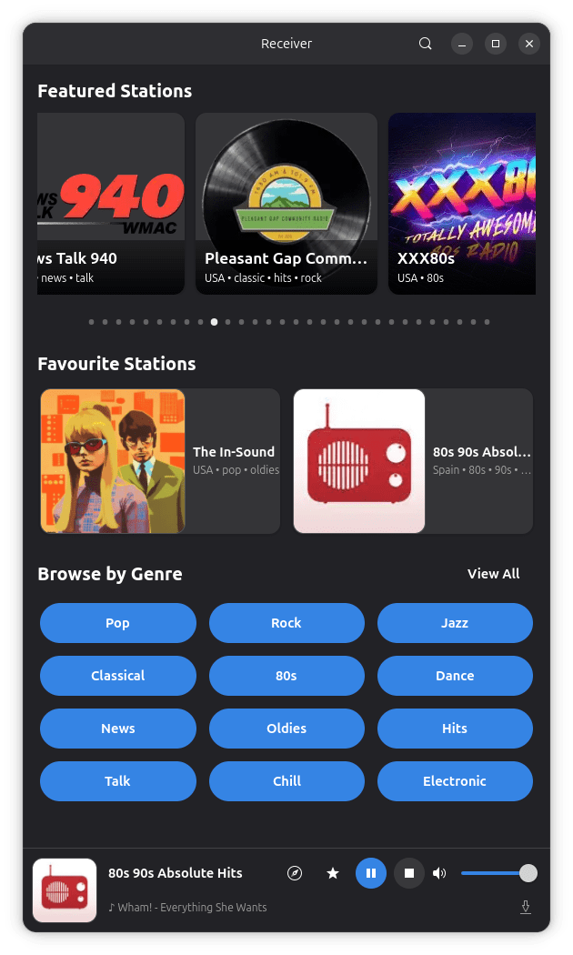 Most radio apps make you search for stations by name or paste in a stream URL. Receiver ships with over 30,000 stations ready to explore — each one individually scanned and verified, with duplicates removed and logos fetched in proper resolution. Just open the app and start discovering.