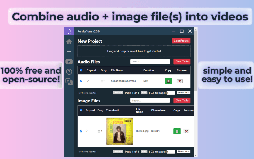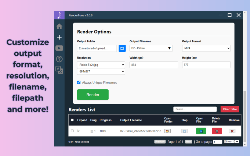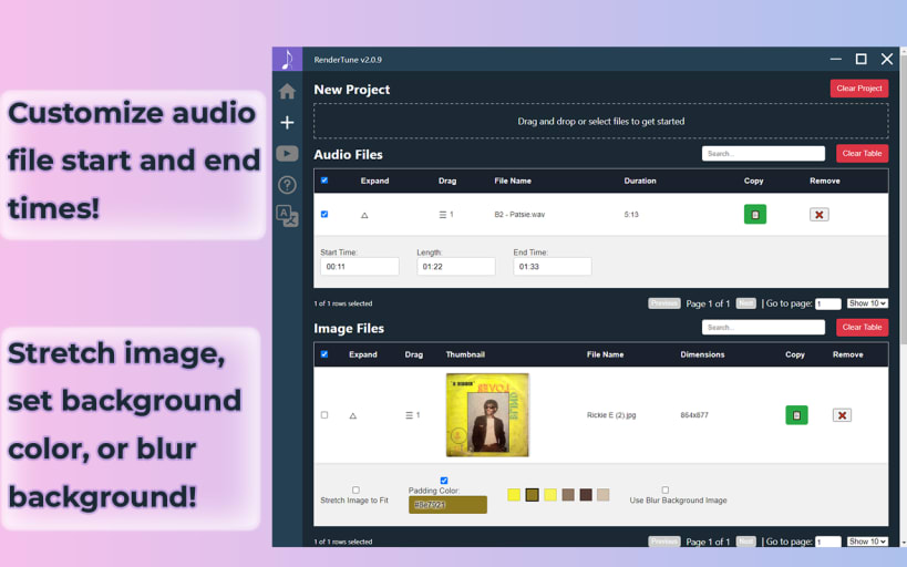 RenderTune is a powerful and versatile video rendering tool that allows you to effortlessly create stunning videos from your audio and image files. With RenderTune, you can combine single or multiple audio files into one video and even choose the order in which they appear. Customize your output video location, resolution, and padding options to achieve the perfect look for your video.