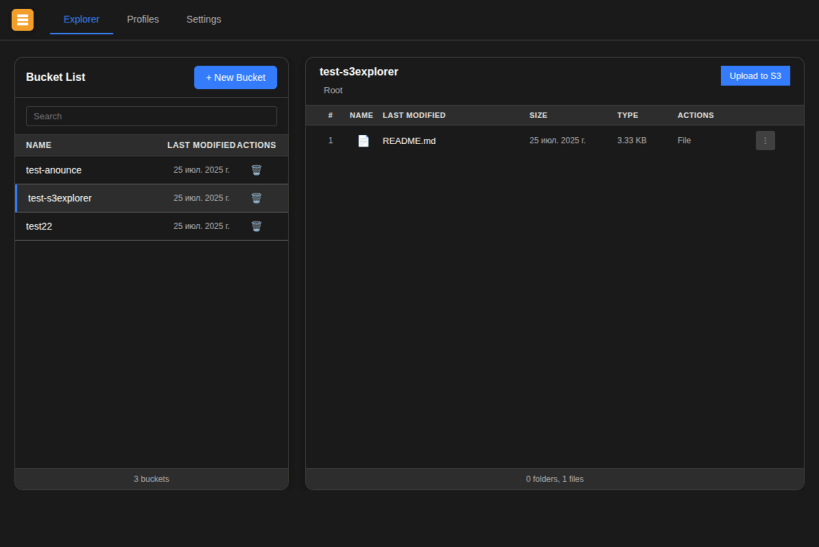 S3 Explorer is a modern desktop application for managing S3-compatible cloud storage. Features include file browsing, uploading, downloading, and comprehensive bucket management.