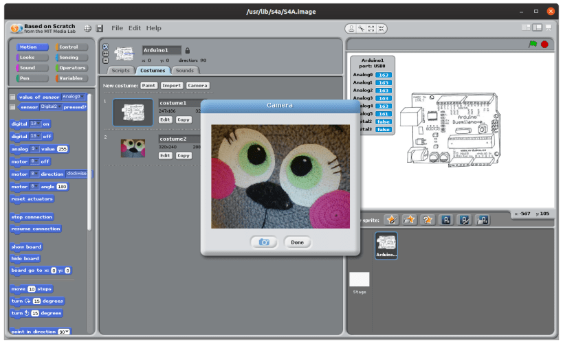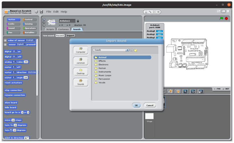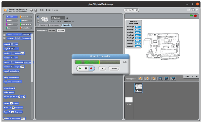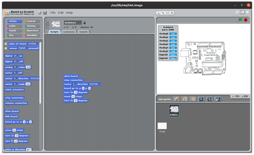 Note: In order to use S4A with an Arduino board, you need to first upload the firmware to the board. See the S4A Getting Started guide for more information: https://merlijn.sebrechts.be/blog/2020-02-s4a-setup-ubuntu/