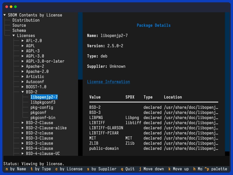 Sbommage is an interactive terminal frontend for viewing Software Bill of Materials (SBOM) files in various formats including SPDX, CycloneDX, GitHub, and Syft. It provides a consistent, user-friendly way to view and explore SBOM data with keyboard navigation and multiple view modes.
