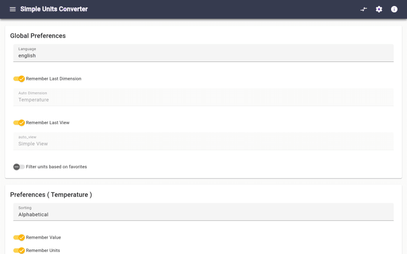 Dimensions(22): acceleration (22 different units), angle (17), area (24), cooking (28), data storage (16), density (16), energy (40), flow (volume) (22), force (16), frequency (8), illuminance (5), length / distance (30), luminance (8), luminous intensity (4), magnetic flux (2), pressure (28), speed / velocity (14), temperature (7), time (20), volume (71), volume - dry (7), weight / mass (36)