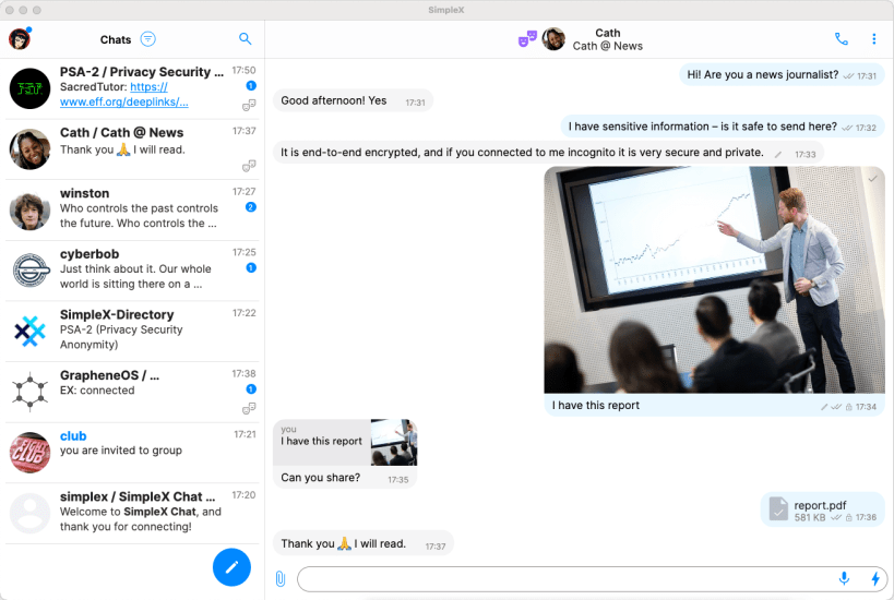SimpleX Chat is a private and secure messaging app that emphasizes privacy by not using user IDs, including phone numbers or random identifiers. Instead, it uses temporary anonymous pairwise identifiers for message delivery,ensuring no long-term identifiers exist.