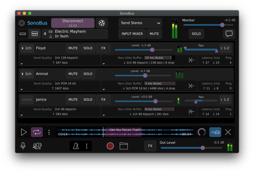 SonoBus is an easy to use application for streaming high-quality, low-latency peer-to-peer audio between devices over the internet or a local network. Simply choose a unique group name (with optional password), and instantly connect multiple people together to make music, remote sessions, podcasts, etc. Easily record the audio from everyone, as well as playback any audio content to the whole group. Connects multiple users together to send and receive audio among all in a group, with fine-grained control over latency, quality and overall mix. Includes optional input compression, noise gate, and EQ effects, along with a master reverb. All settings are dynamic, network statistics are clearly visible.