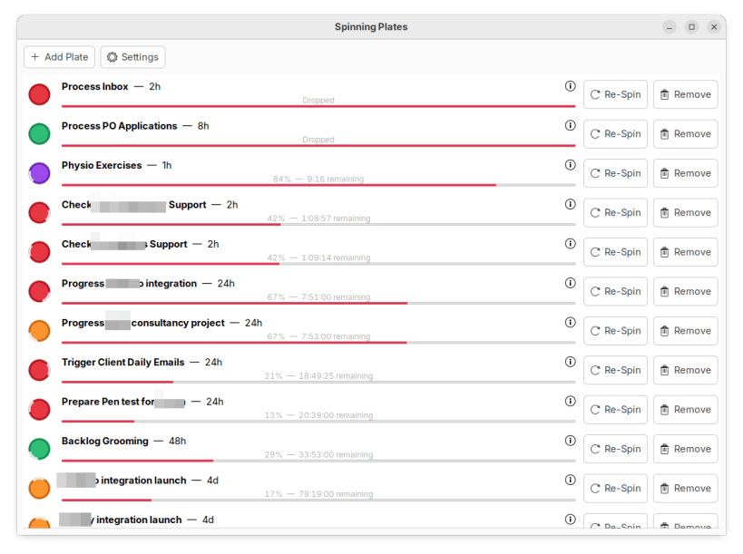 Spinning Plates makes sure you keep on top of your work. Simply add your routine work as 'plates' and set a spin duration that dictates how often you should check-in on each task. Spinning Plates will then make sure you don't miss anything important. The goal is to keep all your plates spinning!