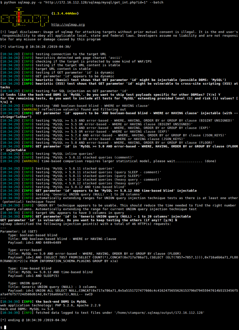 - Full support for six SQL injection techniques: boolean-based blind, time-based blind, error-based, UNION query-based, stacked queries and out-of-band.