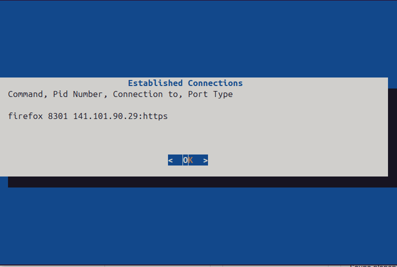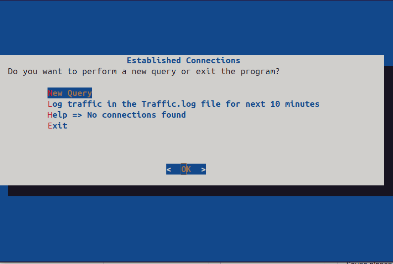 The ssta.bash script displays all currently established connections, including their corresponding process IDs (PIDs). You can also log these connections for 10 minutes into a file called Traffic.csv in Homedirectory if needed.