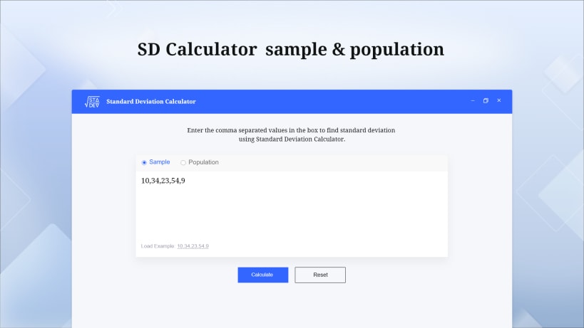 There are two radio buttons for “sample” and “population”, in case you have selected the wrong input type, i.e., you need population standard deviation but accidentally you have selected the “sample”, then you don’t have to worry about that because you can also change it after the calculations.