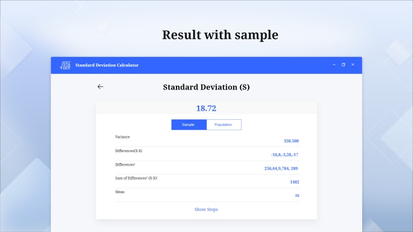 The standard deviation calculator with steps gives you a variety of features. The explanation is as follows