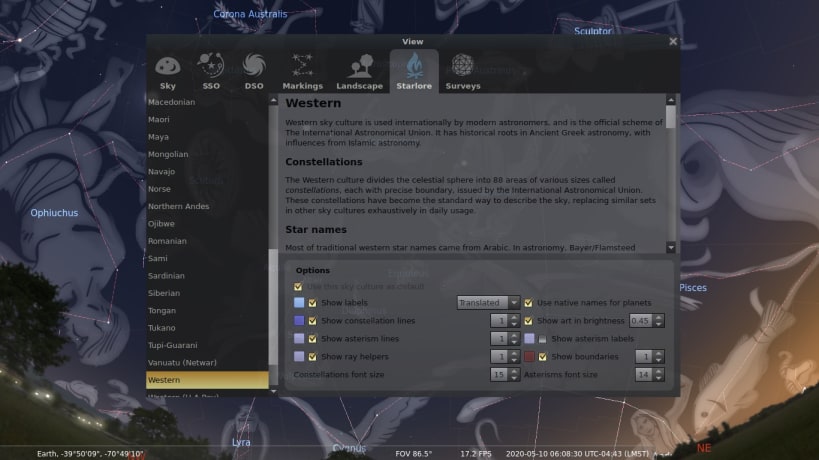 Stellarium has multiple sky cultures - see the constellations from the traditions of Polynesian, Inuit, Navajo, Korean, Lakota, Egyptian and Chinese astronomers, as well as the traditional Western constellations.