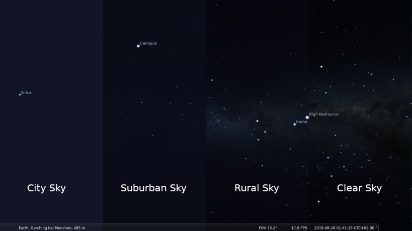 Stellarium renders 3D photo-realistic skies in real time with OpenGL. It displays stars, constellations, planets and nebulae, and has many other features including multiple panoramic landscapes, fog, light pollution simulation and a built-in scripting engine.