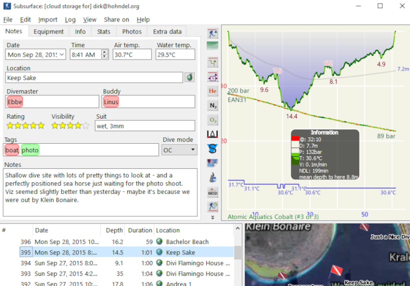 Subsurface can plan and track single- and multi-tank dives using air, Nitrox or TriMix. It allows tracking of dive locations including GPS coordinates (which can also conveniently be entered using a map interface), logging of equipment used and names of other divers, and lets users rate dives and provide additional notes.
