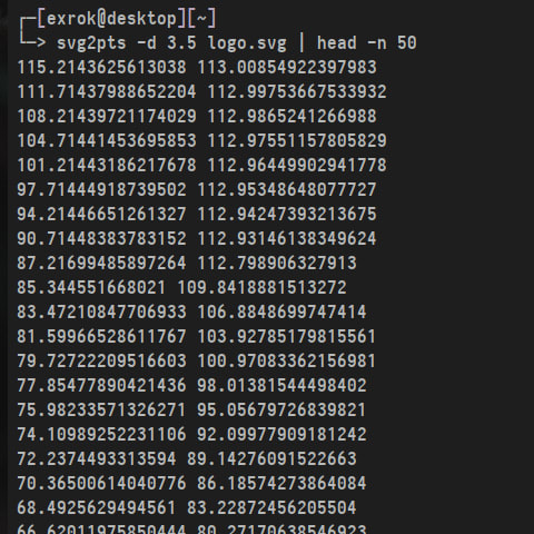 OPTIONS: -a, --accuracy <accuracy> Set target accuracy for bezier curve [default: 0.1] -d, --distance <distance> Set target distance between points, depends on DPI of SVG. If distance == 0.0 point distance not normalized. [default: 0.0]