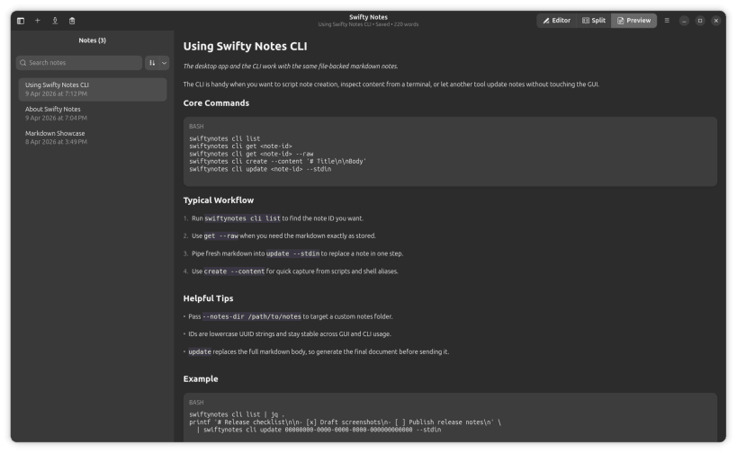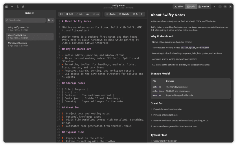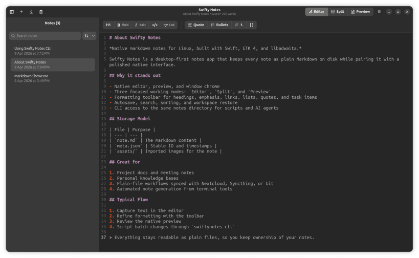 Swifty Notes is a native GTK/libadwaita markdown notes application for Linux.
