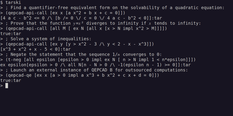 Tarski is a system that provides a command-line interface to a number of functions for computing with Tarski formulas and semi-algebraic sets. It includes fast simplification and UNSAT cores for Tarski formulas, problem formulation for QEPCAD B, Open NuCAD construction and projection, read and write in smtlib syntax. The QEPCAD B system is also included.