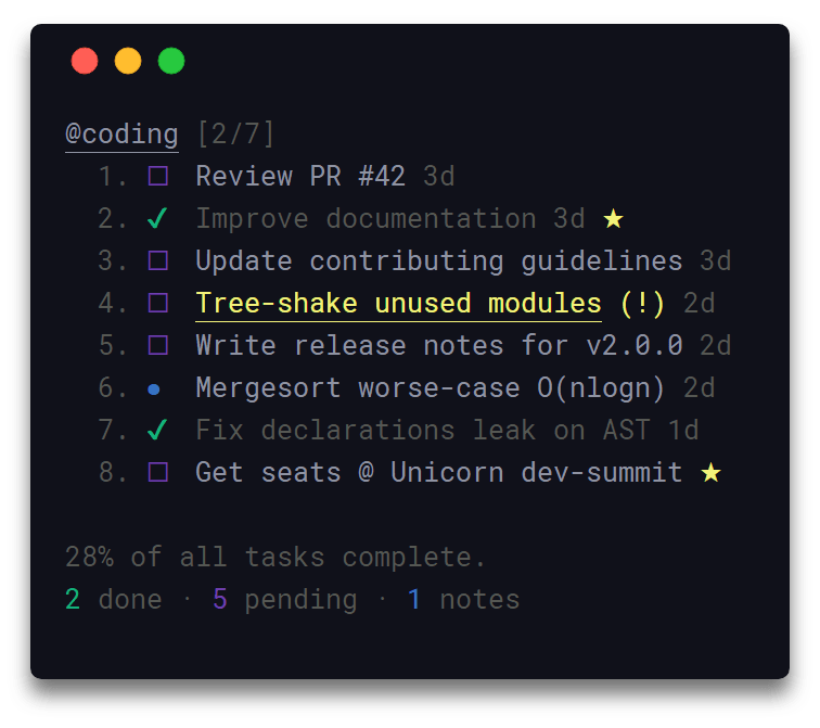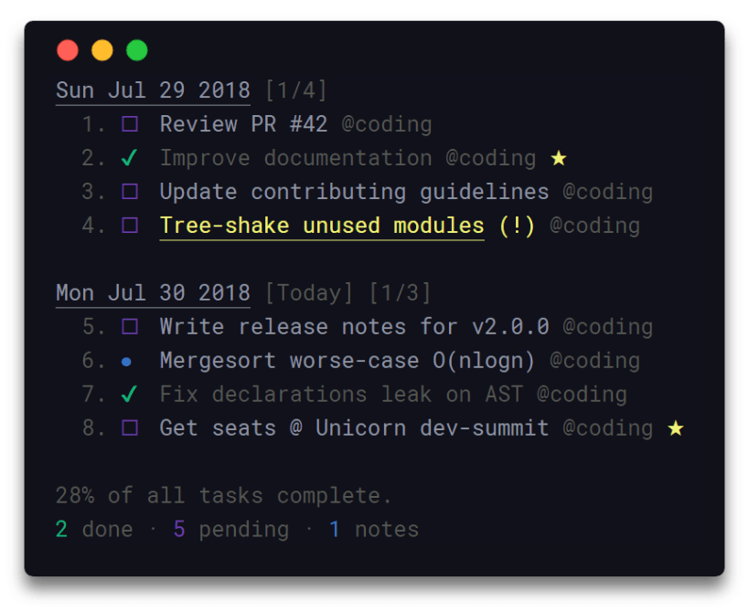 • Organize tasks & notes to boards • Board & timeline views • Priority & favorite mechanisms • Search & filter items • Archive & restore deleted items • Lightweight & fast • Data are written atomically to storage • Custom storage location • Progress overview • Simple & minimal usage syntax • Update notifications • Configurable through ~/.taskbook.json