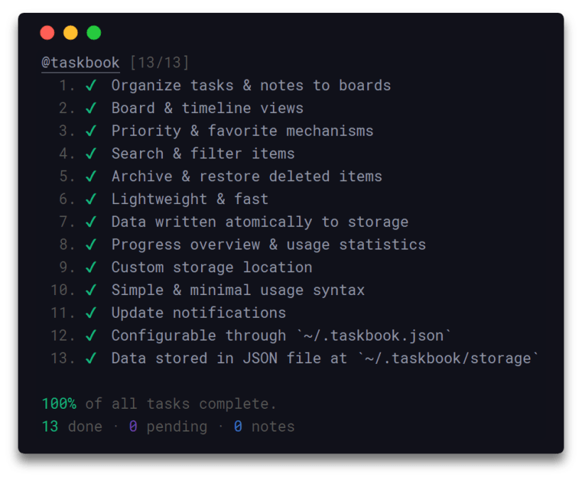 By utilizing a simple and minimal usage syntax, that requires a flat learning curve, Taskbook enables you to effectively manage your tasks and notes across multiple boards from within your terminal. All data are written atomically to the storage in order to prevent corruptions, and are never shared with anyone or anything. Deleted items are automatically archived and can be inspected or restored at any moment.