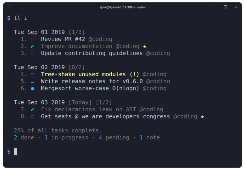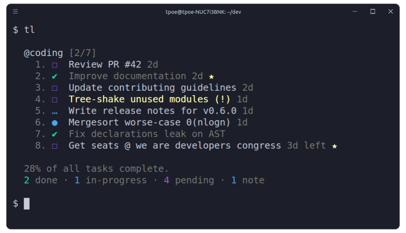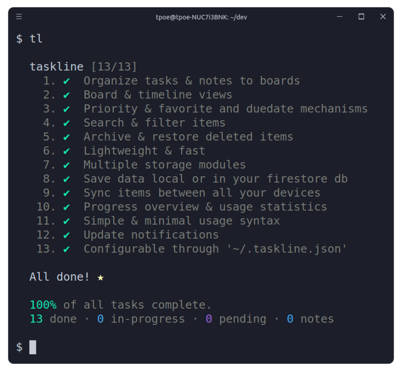 By utilizing a simple and minimal usage syntax, that requires a flat learning curve, Taskline enables you to effectively manage your tasks and notes across multiple boards from within your terminal. All data are written atomically to the storage in order to prevent corruptions. At the moment there are two storage modules. Local storage where your task and are never shared with anyone or anything, or the firestore module, where your tasks are saved in your firestore database and can be shared across all your devices. Deleted items are automatically archived and can be inspected or restored at any moment.
