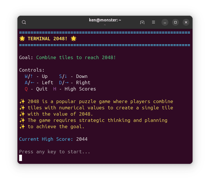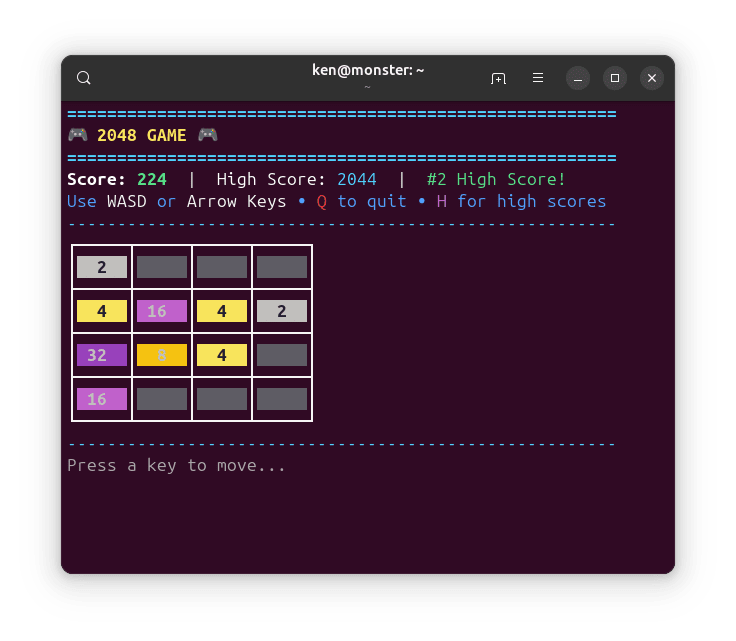 A simple, terminal-based version of the 2048 game. Use your arrow keys or WASD to move the tiles. The goal is to create a tile with the number 2048.