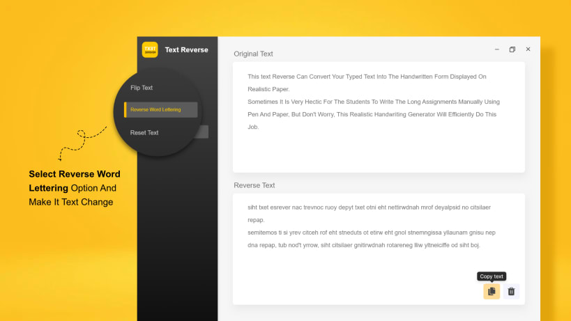 You can use its Reverse Words Lettering and Reverse Wording functions to reverse your text in a new and unique way.