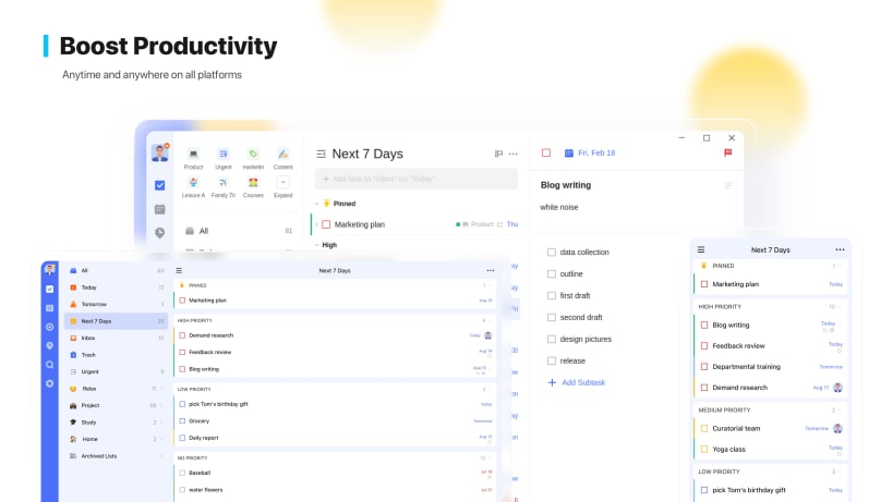 TickTick is a powerful to-do & task management app with seamless cloud synchronization across all your devices. Whether you need to schedule an agenda, make memos, share shopping lists, collaborate in a team, or even develop a new habit, TickTick is always here to help you get stuff done and keep life on track.