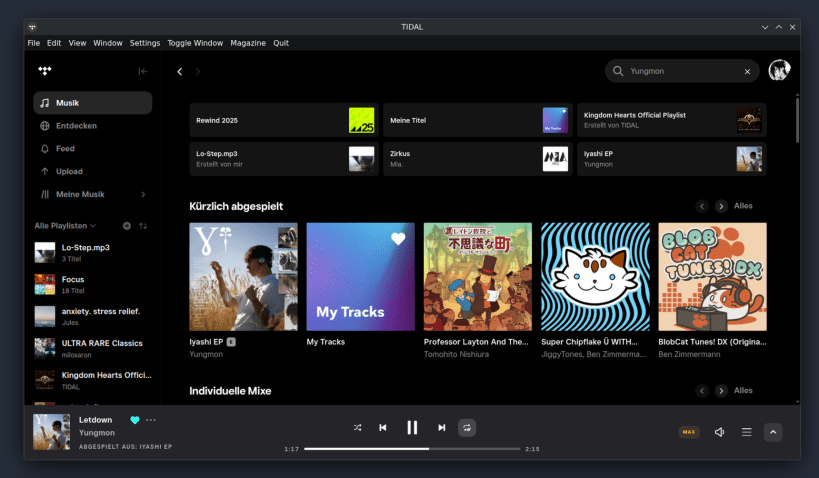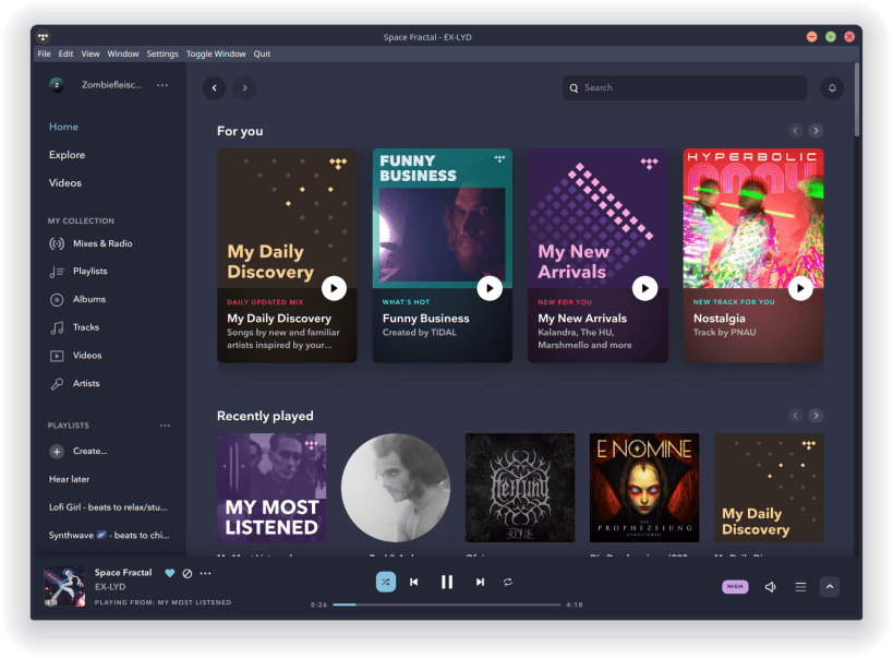 This unofficial electron app for TIDAL music streaming provides high-fidelity audio playback with DRM support, Discord Rich Presence, MPRIS integration, and various customization options for Linux users.