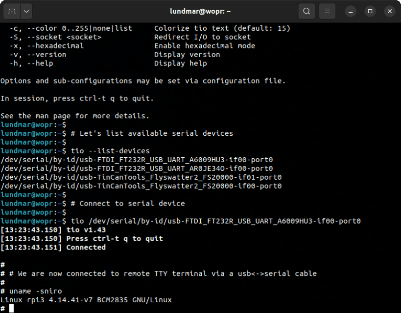tio is a serial device tool which features a straightforward command-line and configuration file interface to easily connect to TTY devices for basic I/O operations.