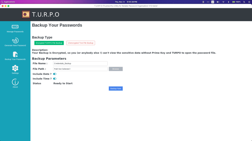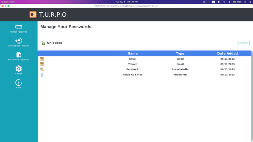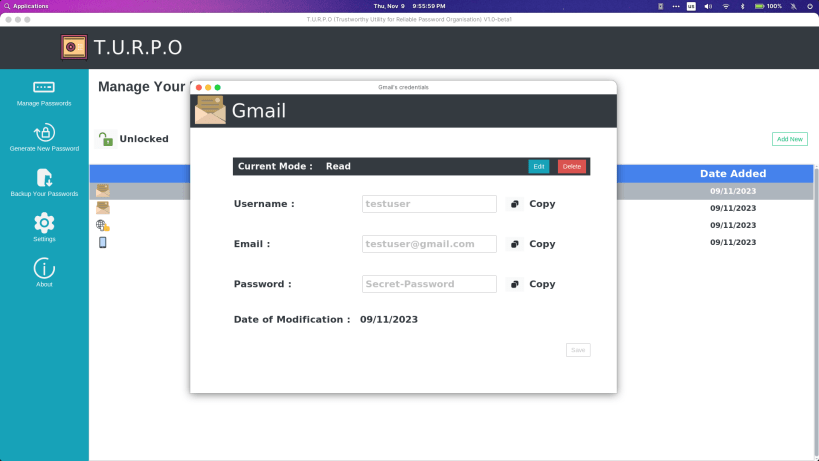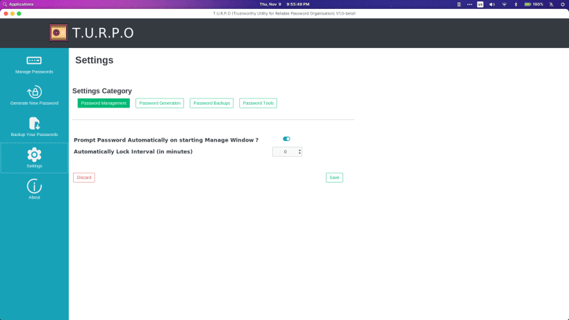 T.U.R.P.O - Trustworthy Utility for Reliable Password Organisation A simple to use, feature-rich, free and Open-Source Password Management Software Currently in Beta Phase, some of the features might be unstable, use it for testing and fun only !