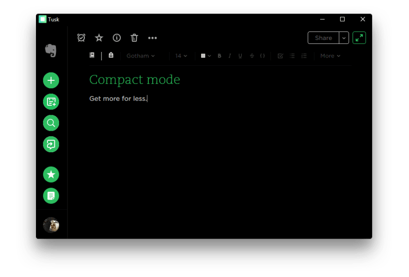 • Black, Dark & Sepia Themes • Focus, Compact & Auto-Night Modes • Local & Global Keyboard Shortcuts • Customizable Keyboard Shortcuts • Export Notes as PDF & Markdown files • Note Printing • Scalable Interface • Note Navigation • Yinxiang Support • Cross Platform • Automatic Updates • Deep OS Integration • Drag and Drop Files
