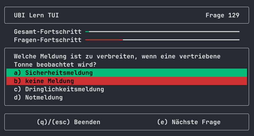 Dies ist eine TUI, um für die "UKW-Sprechfunkzeugnis für den Binnenschiffahrtsfunk"-Prüfung zu lernen. Ein großer Unterschied zu anderen Programmen, die das Gleiche versprechen, ist hier, dass die Fragen direkt eingelesen werden aus der PDF. Sie können entsprechend den neuesten, offiziellen Fragenkatalog online finden und mit diesem Programm automatisch parsen.