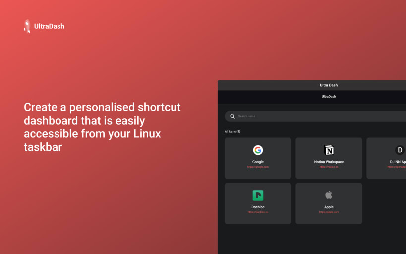 UltraDash is an app designed to increase productivity by creating a streamlined dashboard that stores shortcuts to commonly used Websites, Files, Folders, Applications and Terminal commands for developers.