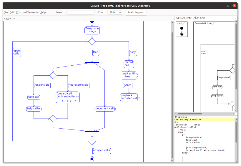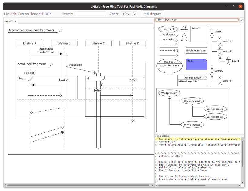 UMLet is a free, open-source UML tool with a simple user interface: draw UML diagrams fast, build sequence and activity diagrams from plain text, export diagrams to eps, pdf, jpg, svg, and clipboard, share diagrams using Eclipse, and create new, custom UML elements.