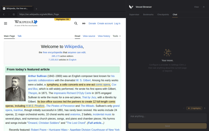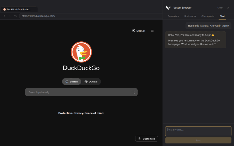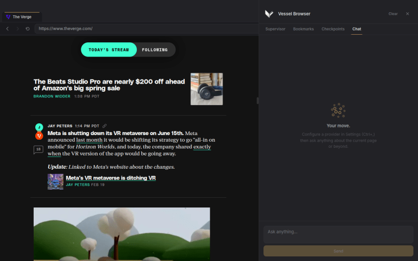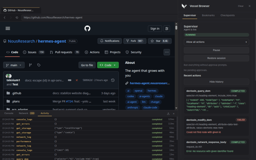 - Agent-first browser model — Vessel is designed around an agent driving the browser while a human watches, intervenes, and redirects