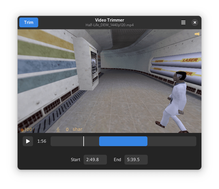 Video Trimmer cuts out a fragment of a video given the start and end timestamps. The video is never re-encoded, so the process is very fast and does not reduce the video quality.