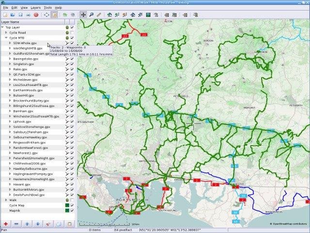 Viking aims to be easy to use, yet powerful in accomplishing a wide variety of GPS related tasks. It uses a hierarchical layering system to organize GPS data, maps, and other layer types with spatial data, such as coordinate lines. https://sourceforge.net/projects/viking/