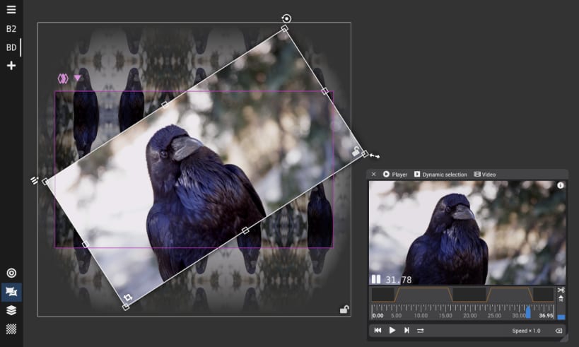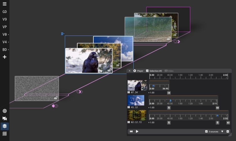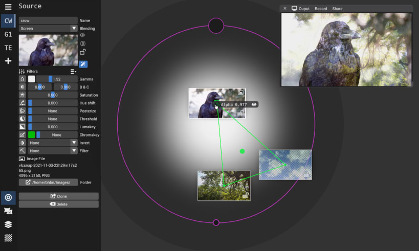 vimix performs graphical mixing and blending of several movie clips and computer generated graphics, with image processing effects in real-time. Its intuitive and hands-on user interface gives direct control on image opacity and shape for producing live graphics during concerts and VJ-ing sessions. The ouput image is typically projected full-screen on an external monitor or a projector, but can be recorded and streamed live (no audio).