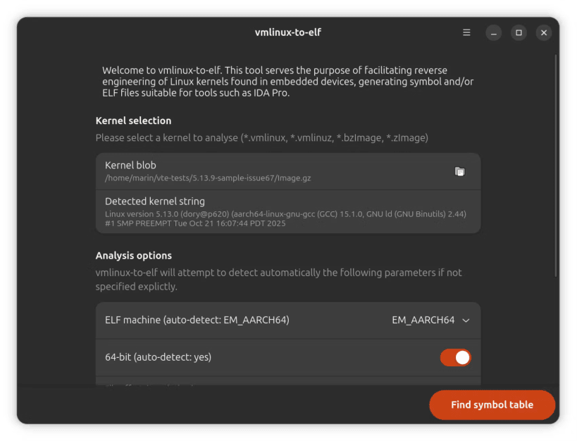 vmlinux-to-elf is a tool to recover a fully analyzable .ELF from a raw kernel, through extracting the kernel symbol table (kallsyms)