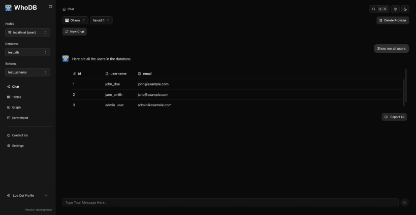 WhoDB has integration capabilities with OpenAI, Ollama, and Anthropic and lets you speak with your data and make sense of it.