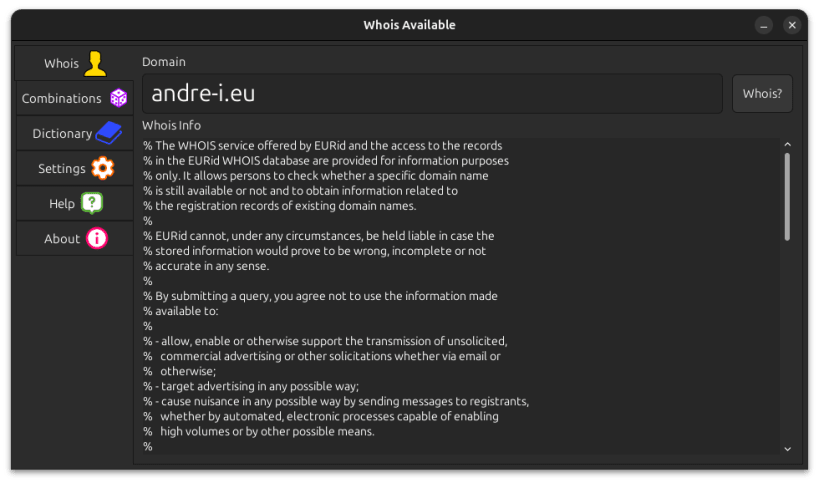 Whois Available is a whois GUI application that allows to check if a domain is available by trying all combinations present in a provided charset (combination mode) or by using a dictionary. WhoisAvailable can be used also from the command line.