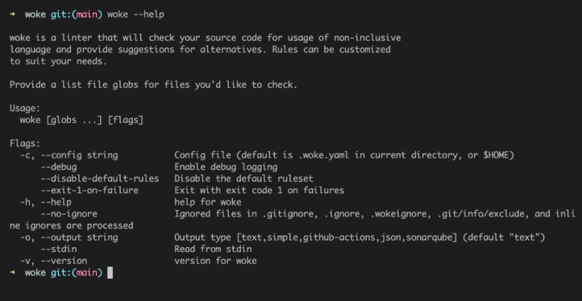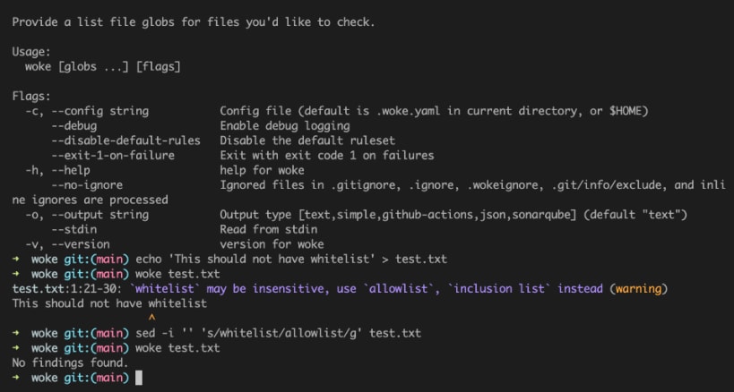 Creating an inclusive work environment is imperative to a healthy, supportive, and productive culture, and an environment where everyone feels welcome and included. woke is a text file analysis tool that finds places within your source code that contain non-inclusive language and suggests replacing them with more inclusive alternatives.