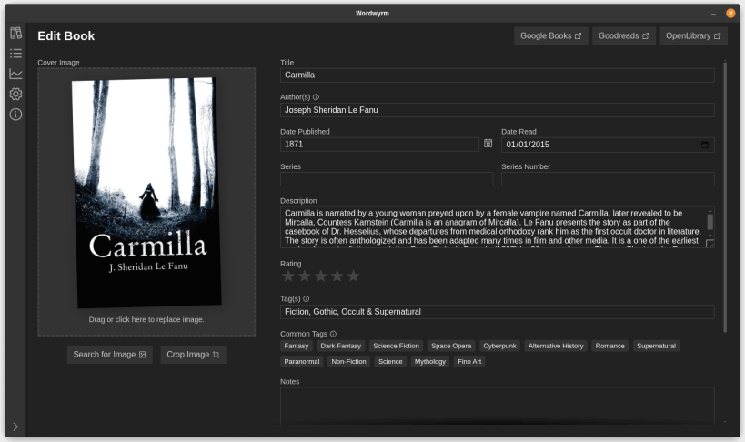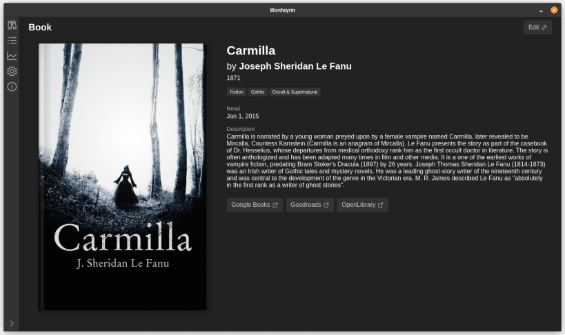 Wordwyrm is a cross-platform desktop app for tracking what books you've read and when. You can add books manually or by searching for them.